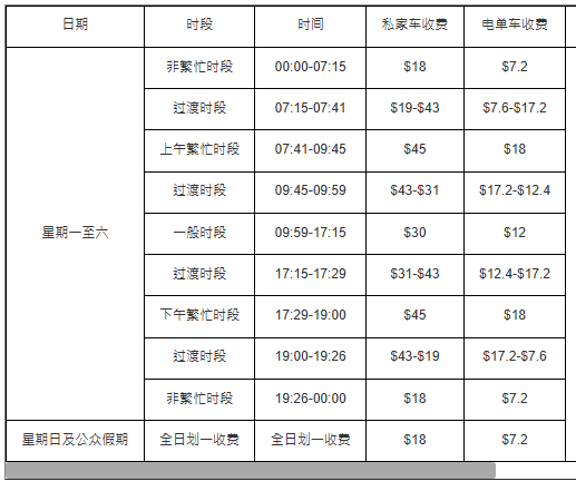 新收费方案生效后,星期一至六私家车及电单车采用分段收费,各时段之间设过渡时段逐步调整。私家车繁忙时段收费为45元,一般时段30元,非繁忙时段18元;电单车繁忙时段收18元,一般时段12元,非繁忙时段7.2元。的士收费则全日划一为28元,货车及巴士等商用车辆同样全日划一收43元。