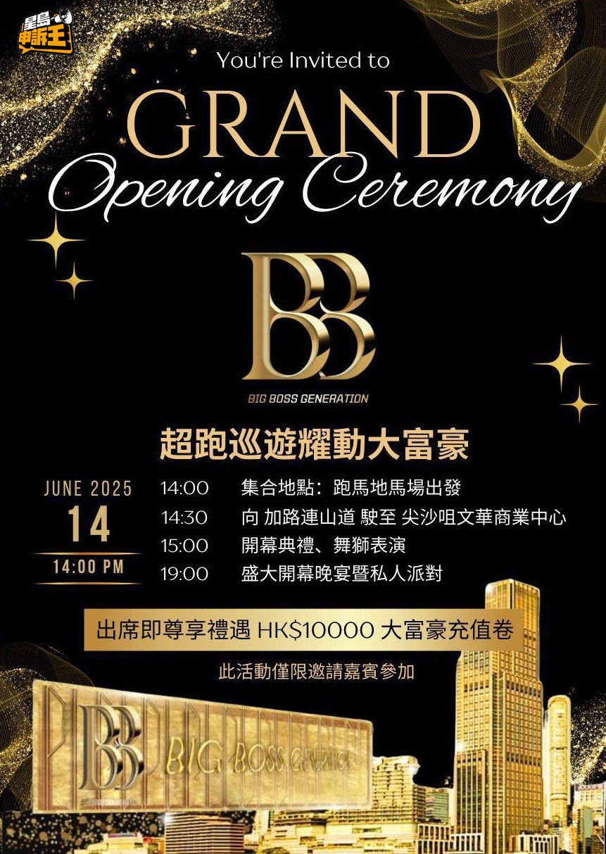 《星岛申诉王》取得新“大富豪”向贵宾发出的邀请函,并得知当中的开幕细节。邀请函抬头以新“大富豪”英文名“Big Boss Generation”的简写发出,简称“BB”,开幕日期订为6月14日星期六。