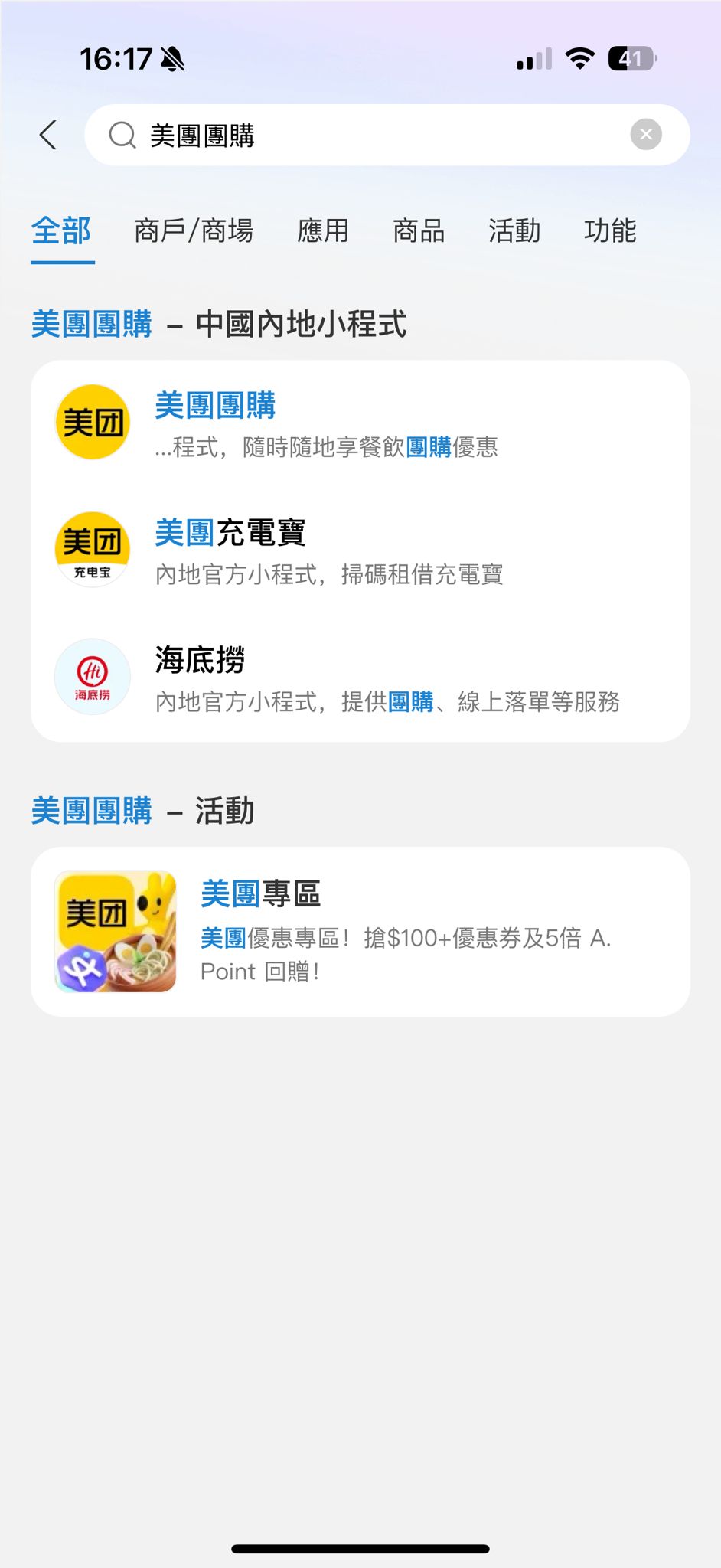 1.在AlipayHK内搜寻“美团团购”,进入小程序