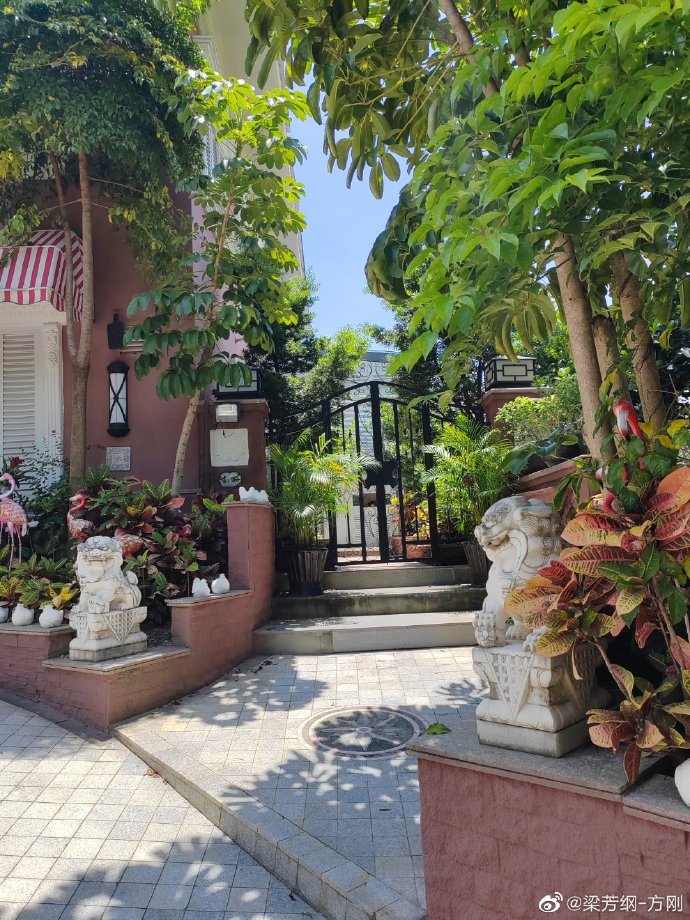 ▲翻新后墙身油上红色,大宅正门仍然摆放了一对石狮子,并保留了旁边的喷泉。