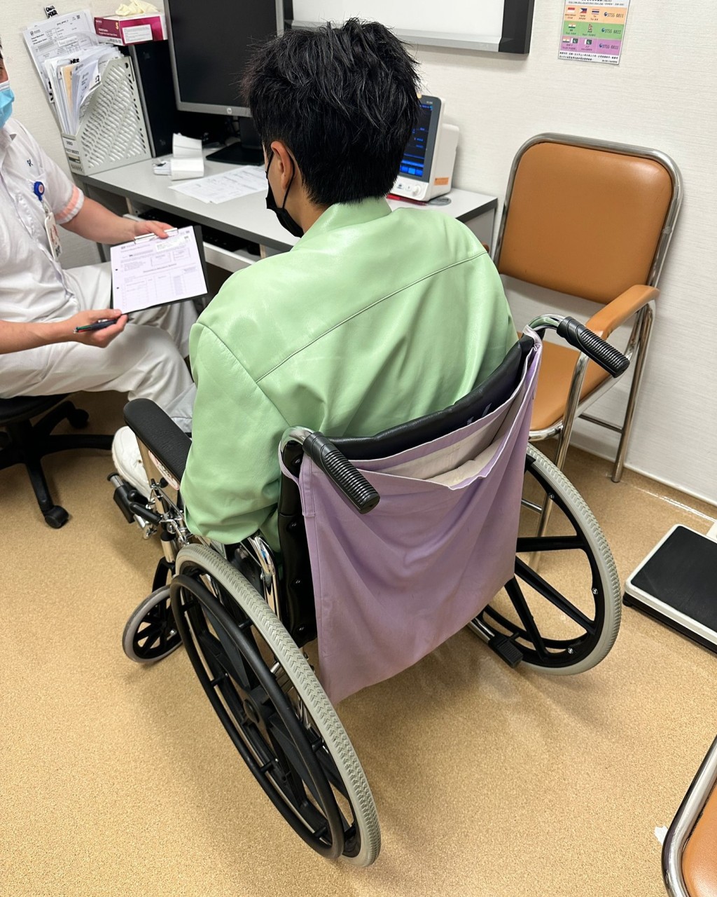 ▲梁钊峰上载几张坐轮椅、躺病床以及痛到蹲在地上的照片。