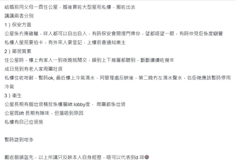 最近有女网民以“由公屋妹变做私楼妹既感觉”为题发文,分享由婚前与家人同住公屋,到婚后与丈夫搬入大型私人屋苑的感受,并从3方面列出两者的分别,如治安问题及邻居质素等,引来不少网民热议,当中有人表示认同“出边租屋贵就系赢系个居住环境同配套”,惟亦有不少人斥楼主说法有贬低他人之嫌,又劝楼主无需太介怀住公屋抑或私楼:“ 公屋就系你人生经历的一部分“。