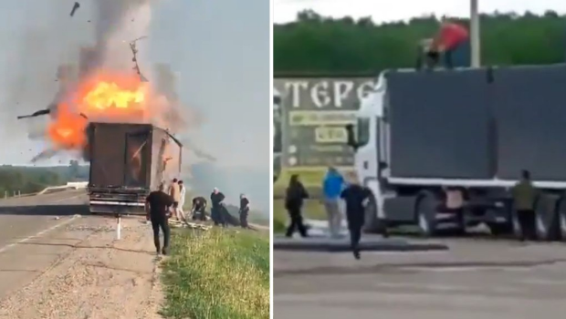 俄媒称,石头可能堵住无人机的起飞舱口,这非常危险,因为无人机是自爆机,而己货车也装了自爆装置。随后再有影片流出,见有民众进入货柜车时,瞬即发生爆炸。惟未知情。