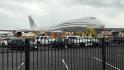 ▲2025年2月15日,美国总统特朗普的车队停在在美国佛州西棕榈滩的卡塔尔赠予的波音747-8。(路透社)