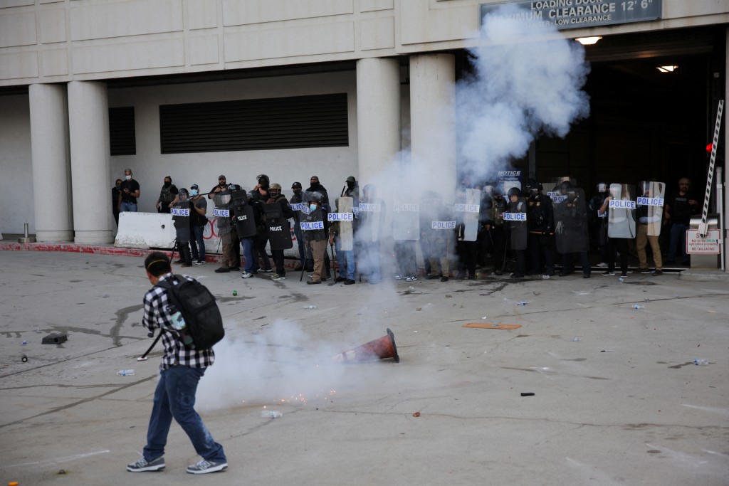 洛杉矶当地电视台KABC-TV报道,执法行动结束后,部分抗议者试图阻挡执法车辆离开。电视台播出的空拍画面显示,执法人员向街道投掷烟雾弹或闪光弹,驱散拦截车辆的人潮。