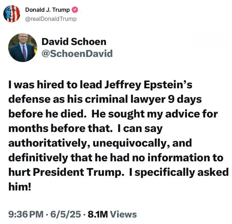 据环球网报道,特朗普当天在其自创社交平台上发出一张图片,图中是律师大卫·舍恩的言论,舍恩曾在爱泼斯坦死亡前不久被聘为其首席辩护律师。舍恩称,“在杰弗里·爱泼斯坦去世前9天,我受聘成为他的刑事律师为他辩护。在此之前的几个月里,他一直在征求我的意见。我可以权威地、明确地、肯定地说,他(爱泼斯坦)没有任何可以伤害特朗普总统的信息。我特意向他核实过!”