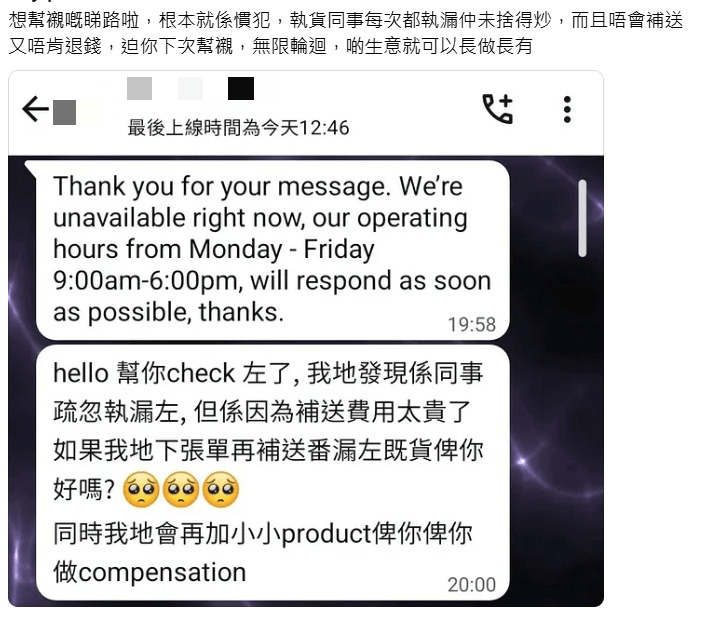 然而事主批评处理手法“离晒大谱”,不满表示“你哋送漏咗嘢,叫我再买先补返嚟?”又指出今次事件并非单一失误,以往亦曾发生订单延误送货,事主坦言:“每一次嘅处理,都系要我去承受你哋出错嘅后果⋯⋯咁唔洗Mark送货日同时时段啦,即系收咗钱,钟意几时送,送几多,点送系你哋决定?”