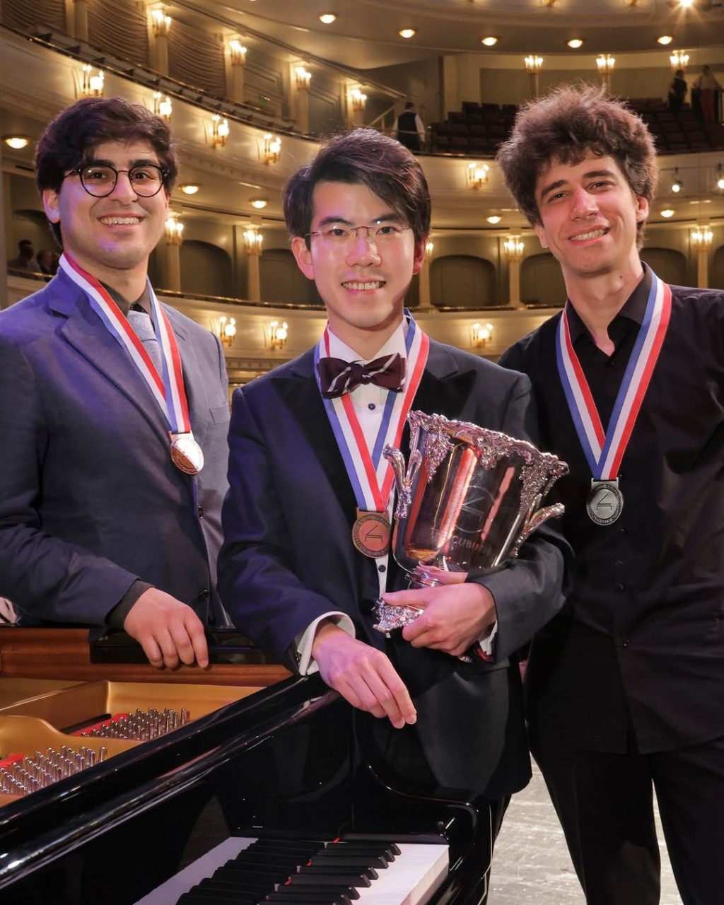 ▲29岁的香港年轻钢琴家沈靖韬(Aristo Sham)(中),在范克莱本国际钢琴赛2025赢得冠军。The Cliburn IG图片