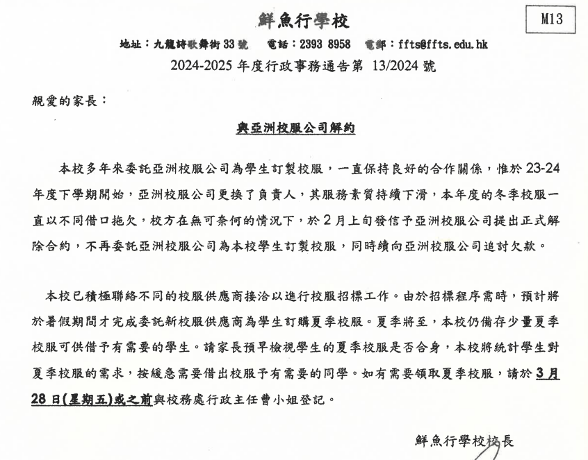 据了解受影响学校为鲜鱼行学校,学校官网显示早在今年3月份校方已发家长通告,宣布与亚洲校服公司解约。校方指出,与亚洲校服公司合作多年,关系一直良好。然而,自2023至24年度下学期起,该公司更换负责人后,服务质素持续下降。本学年的冬季校服更以不同借口一再拖欠。校方于本年2月上旬已正式发信予亚洲校服公司,提出解除合约,不再委托其服务,并同时展开追讨欠款程序。