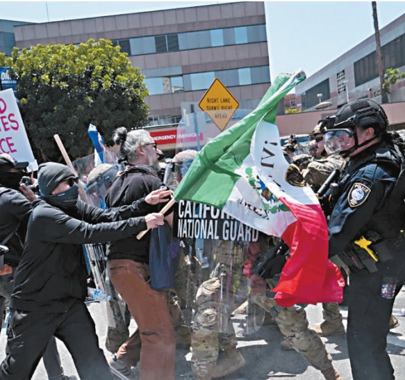 ▲抗议者在洛杉矶市中心与当局发生冲突。