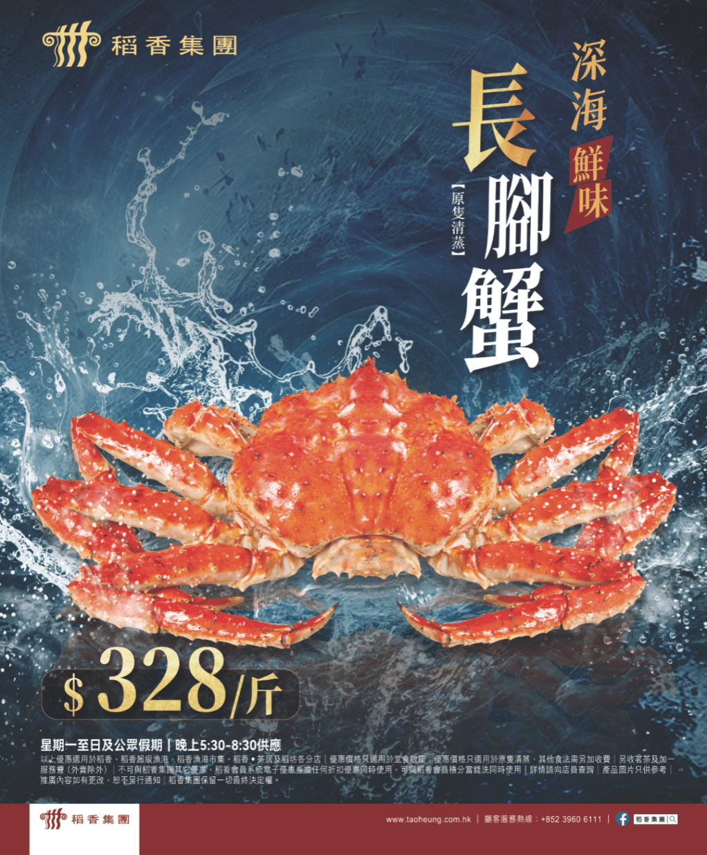 稻香集团长脚蟹优惠逢星期一至日及公众假期,晚上5时30分至8时30分供应,适用于稻香、稻香.茶居及稻香超级渔港分店。这次优惠以主打新鲜“深海长脚蟹”,经过清蒸处理,完美保留了蟹肉的细腻口感,将原汁原味的鲜甜展现得淋漓尽致,每斤仅需$328,即可为晚餐增添一份滋味与欢乐。