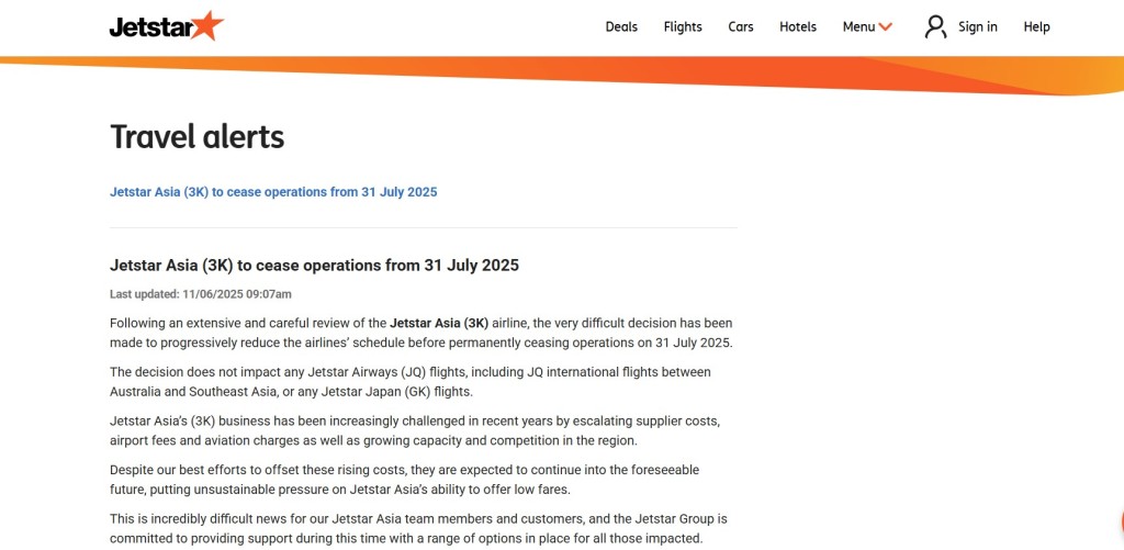 Jetstar Asia捷星亚洲航空(3K)今日(11日)宣布,将于下月底停止营运。捷星亚洲航空表示,将在未来七周内继续营运航班,但航班时刻表将逐步减少,直到2025年7月31日停止营运。已预订而被取消航班的乘客将获得全额退款,集团也将尽可能安排乘客转乘其他航空公司航班。