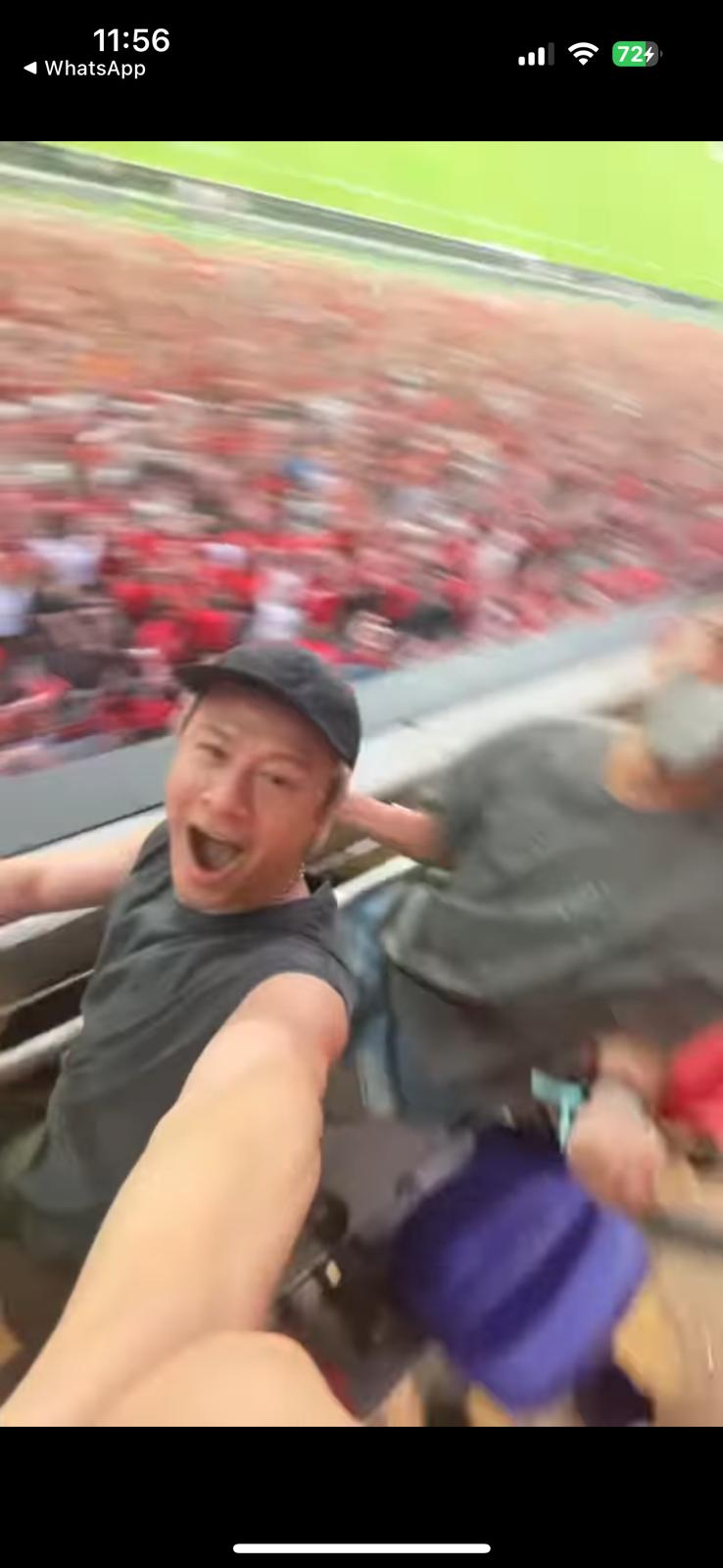 至于邹凯光亦同样坐在场内底层座位,但他的位置是底层座位的最高一排,亦即是其视线与包厢观众相近,视觉上仅低约两行座位。邹凯光的座位视线刚好在龙门正后方,与“港队打气区”非常接近。当港队射12码时,他的视线正好看着球滚入龙门,而龙门后方场地方面用围栏做了分隔区,一众港队成员在胜出比赛后,都纷纷跑入该区域与港队球迷互动合照,而且写上“港队劲揪”的大型TIFO亦在该区出现,因此邹凯光的座位,可以说是全场气氛最热烈的区域。
