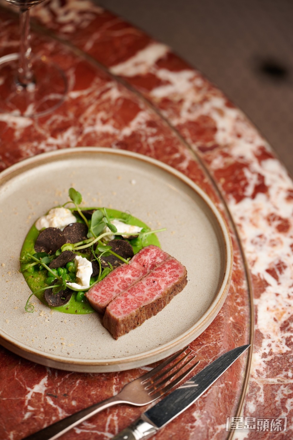 主菜方面则有A5和牛西冷配黑松露、水牛芝士、烤榛子及田园青豆,和牛在铁板上即席现烤,散发油脂香气,肉质入口即化。巴斯克芝士蛋糕作为甜品更是充满惊喜,主厨即场用火枪炙烧焦糖面层,蛋糕外层微焦,内里绵密,搭配香浓的云呢拿酱,甜而不腻,为晚餐完美作结。