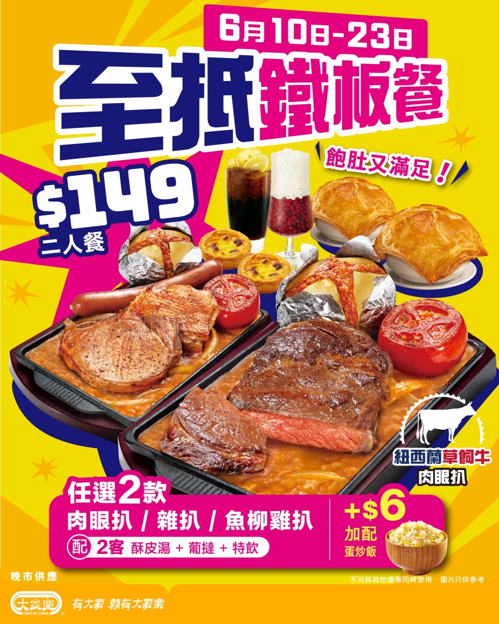 大家乐铁板餐优惠限时回归!即日起至6月23日(一),只要于指定时间内到访大家乐分店,即可以$149的价钱享用铁板二人餐,包括铁板肉眼扒、酥皮汤、葡挞及特饮各两客,即睇优惠详情!
