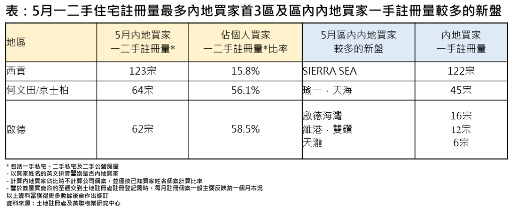 西贡区因有新盘热销,成为5月最多内地买家注册登记的区域; 何文田及启德两区的内地买家占比均超过五成,反映对市区铁路新盘的偏好,其中启德更是近年备受内地买家追捧的热门置业区域。