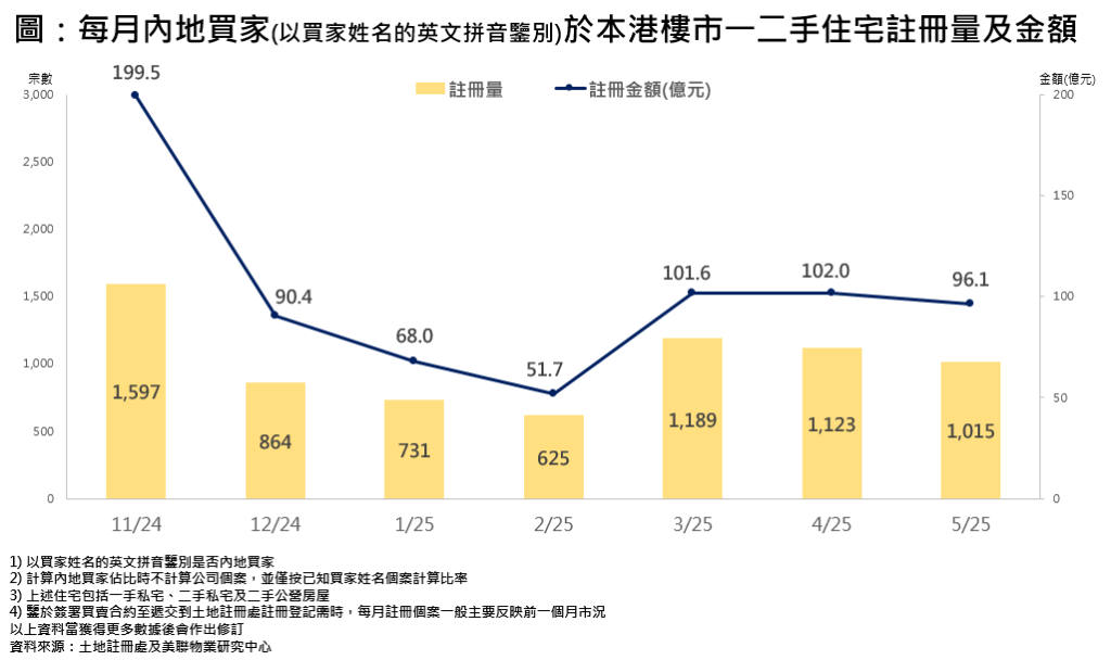 受到关税战及股市显著波动影响,5月内地买家住宅注册量减少。 美联研究中心综合土地注册处资料显示,按已知买家姓名作分析,上月内地买家(以买家姓名英文拼音鉴别)住宅注册量录约1015宗,按月下跌约9.6%; 涉及金额约96.1亿,按月减少约5.8%。