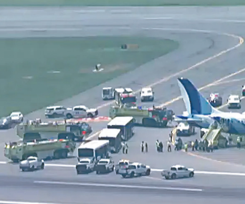 机场营运商说,地面停飞令已于东部时间下午1点18分被解除。网络上流传的照片显示,涉事客机停在一片草地上,周围是救援人员及车辆。