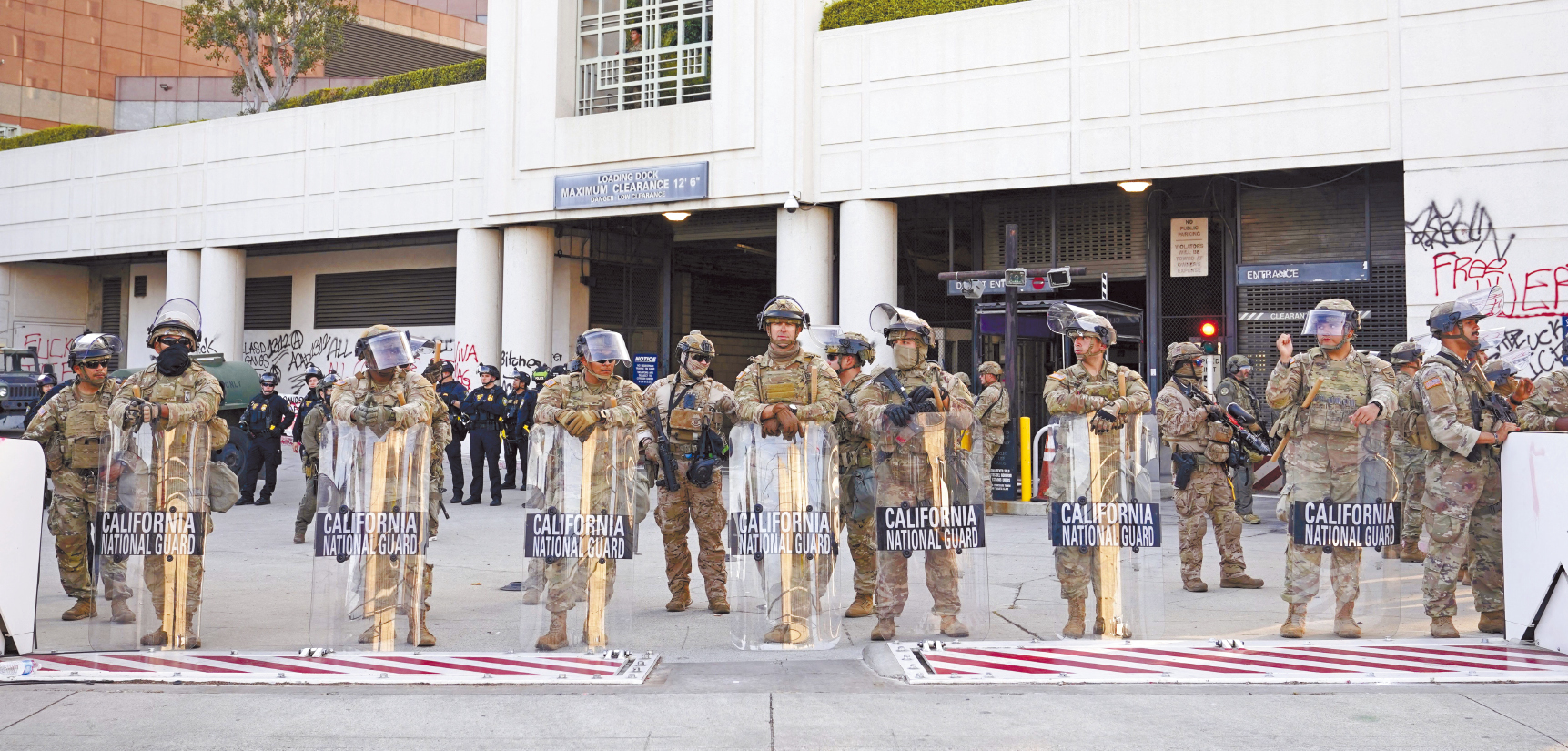 ▲加州洛杉矶,国民警卫队成员在一幢联邦大楼外站岗。 路透社
