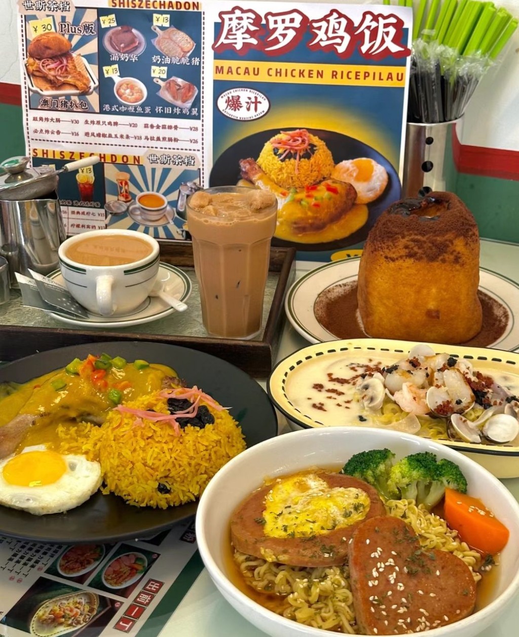 世斯茶档是前TVB艺人古明华创办的港式茶餐厅,总店在人流较旺的蓬江区,从广珠城际铁路江门东站搭的士很近,古明华和汤俊明坐镇,不时招待香港艺人,例如阿Bob林盛斌、薛家燕、陈晓华、何广沛等。DIY壶仔奶茶口味自己调配,加上邪恶美食火山漏奶华,很有港式风味。特色美食餐蛋一丁有心形午餐肉,秘制马拉盏捞丁、招牌嚤囉鸡饭、加大版澳门猪扒包、旺角炸大肠、生炸鸡髀、避风塘椒盐玉米条等性价比高,是网红打卡好去处。