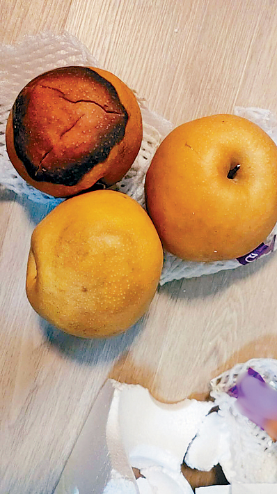 ▲有市民展示网购成果,有水果已腐烂。