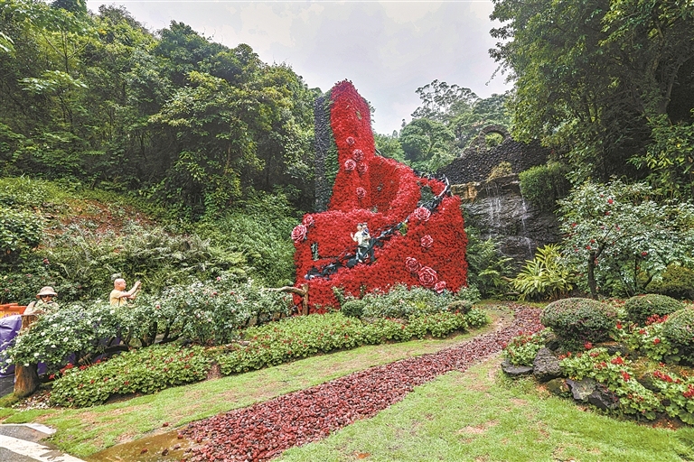 天人山水选用的第一批设计师既不是景观设计师,也不是建筑设计师,而是山水画家。他们从中国山水画中寻找灵感,让建筑“不与山水争辉,只能添美”。园区内没有重复的建筑或园林,每一栋都与山水高度融合。莫道明告诉记者,正是这种热爱和坚持,使得景区里的每一块石头,甚至糯米糍荔枝树根都被赋予艺术生命。