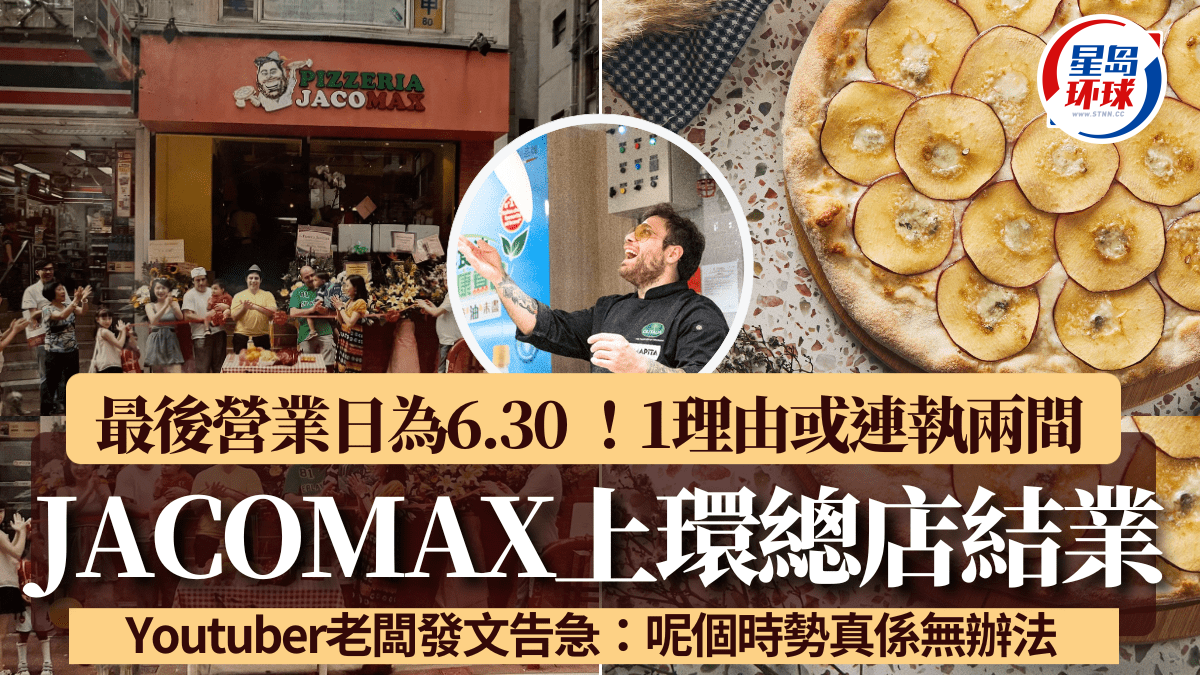 香港结业潮持续,人气薄饼店JACOMAX日前宣布上环总店将于6月底结业,结束长达14年的营运。 JACOMAX主理人兼Youtuber Jacopo Contiero发文交代结业原因,同时指出旗下铜锣湾店或因同一理由而被迫无奈结业,同时于文中亦感谢所有曾光顾的顾客,感叹:“呢个时势真系无办法。”