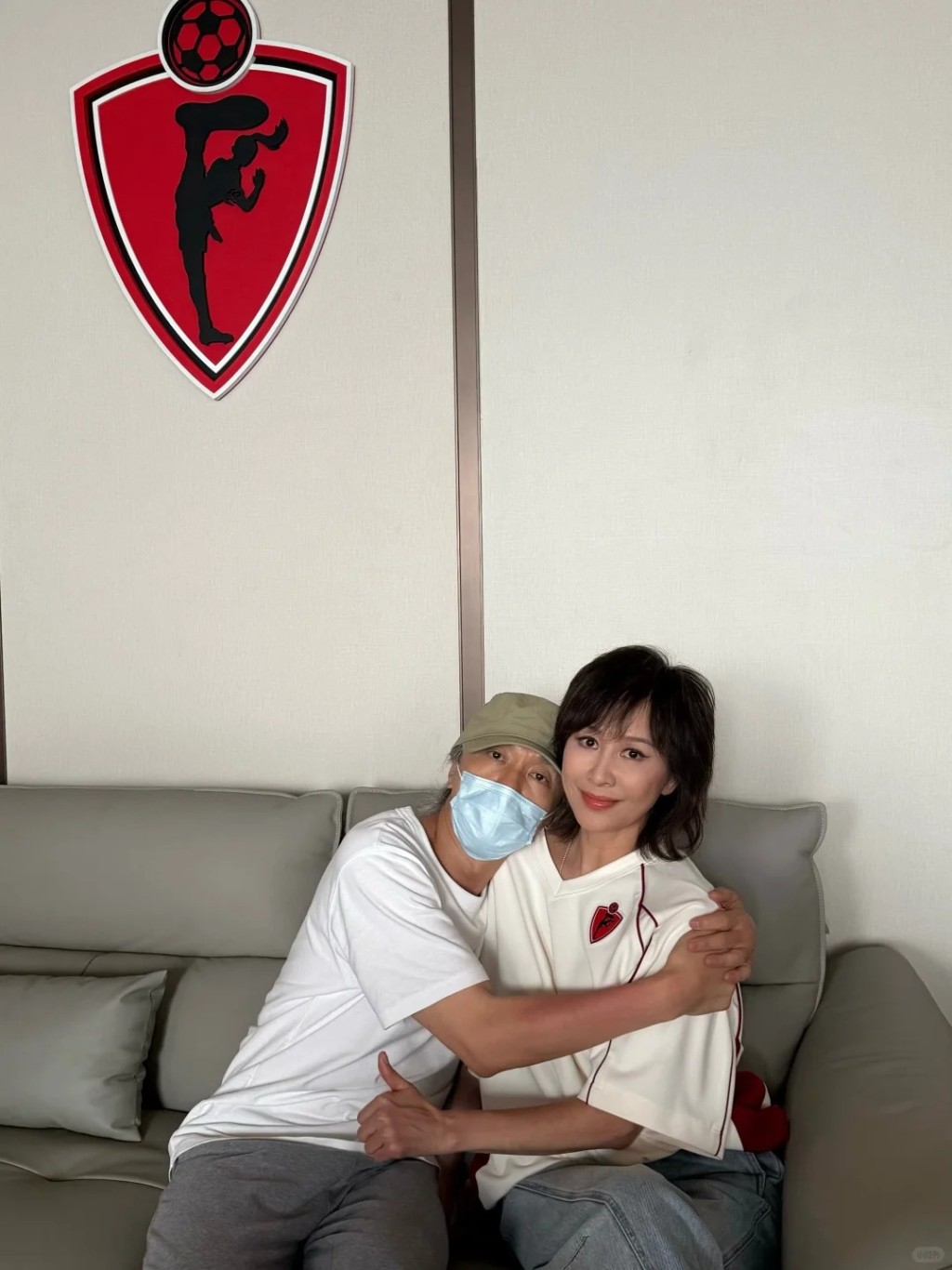 刘嘉玲昨日(17日)于小红书分享一幅与周星驰的合照,周星驰简单穿上白色5短Tee、戴上帽子,贯彻其一贯的低调装扮,他虽然未有除下口罩,但从他的双眼和斑白的发鬓,都可以见到他沧桑了不少。 不过他童心未泯,竟然将头伏在刘嘉玲的肩上,并以双手亲切地环抱对方,画面既搞笑又温馨。