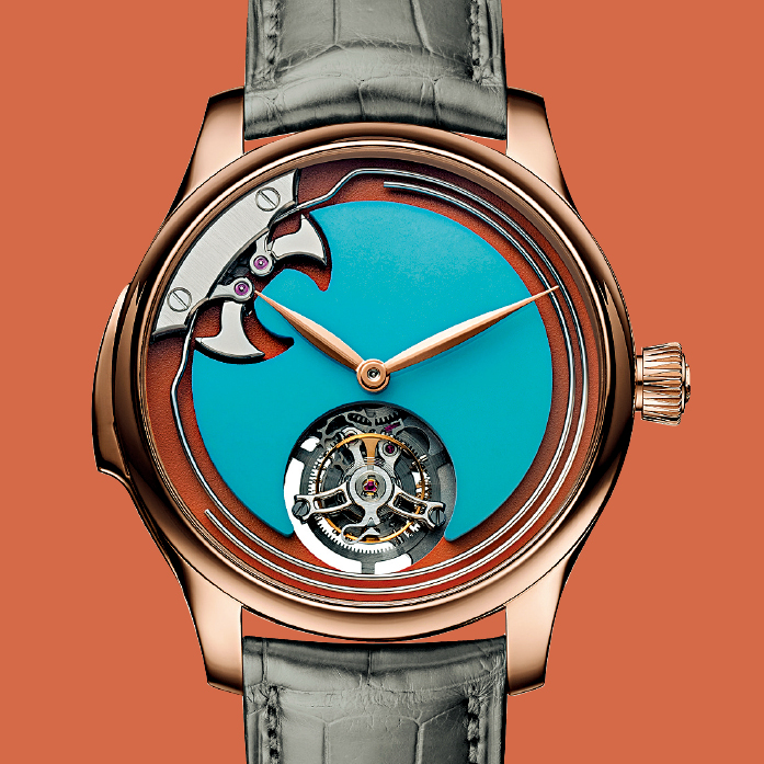 这个全新概念表系列的独特亮点,在于选用了6种彩宝,包括缅甸玉、绿松石、珊瑚、粉红蛋白石、青金石、柠檬绿玉髓,互相组合出共18个拼色表盘型号。品牌亦贯彻其简约风格,没有刻度的表盘设计,除可凸显天然宝石本身的色泽与质感之外,无论是小秒针,还是两款陀飞轮腕表均配有的那个可窥见内藏机芯的镂空圆孔,都是放在6点位置,清晰简洁地打造表盘上的吸睛焦点。此外,每款腕表所搭配的双色皮革表带,背面色彩正是表盘主色,悦目又不浮夸。