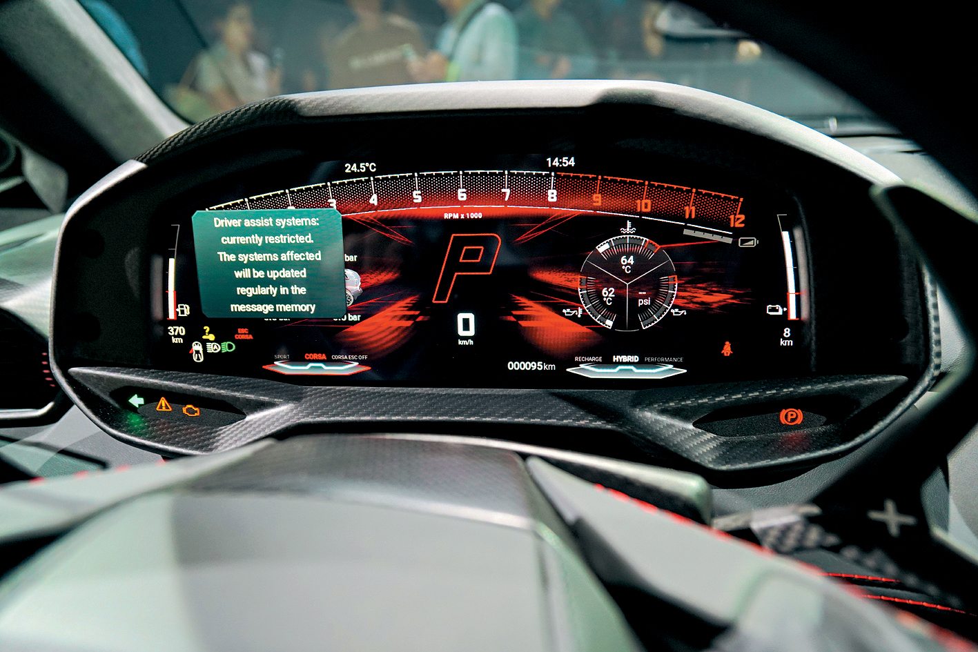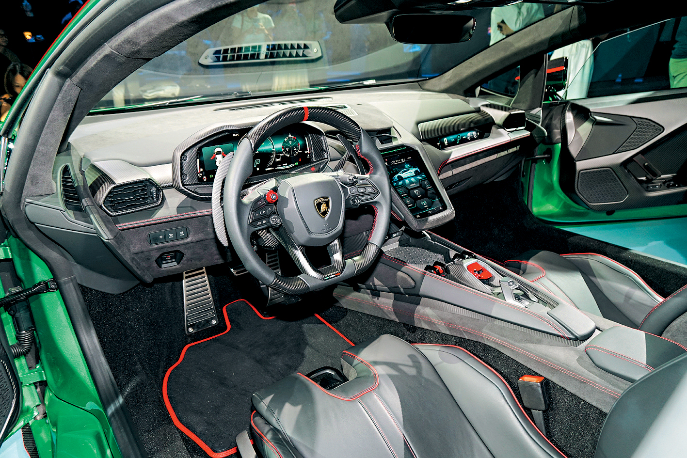 Temerario配备全新铝合金Spaceframe车架,结构刚性比Huracan增强两成,净重1,690kg。车身相比Huracan长了247mm、扩阔72mm和增高36mm,轴距延伸38mm至2,658mm。车厢空间比Huracan阔落许多,内装酷似Revuelto,同样设有三组屏幕,包括12.3吋数码表板、8.4吋直立中央屏幕,以及可选配的乘客席9.1吋多媒体触屏。 盘有2组旋钮键,合共带来13种驾驶模式,包括首次引入的Drift(漂移)等。