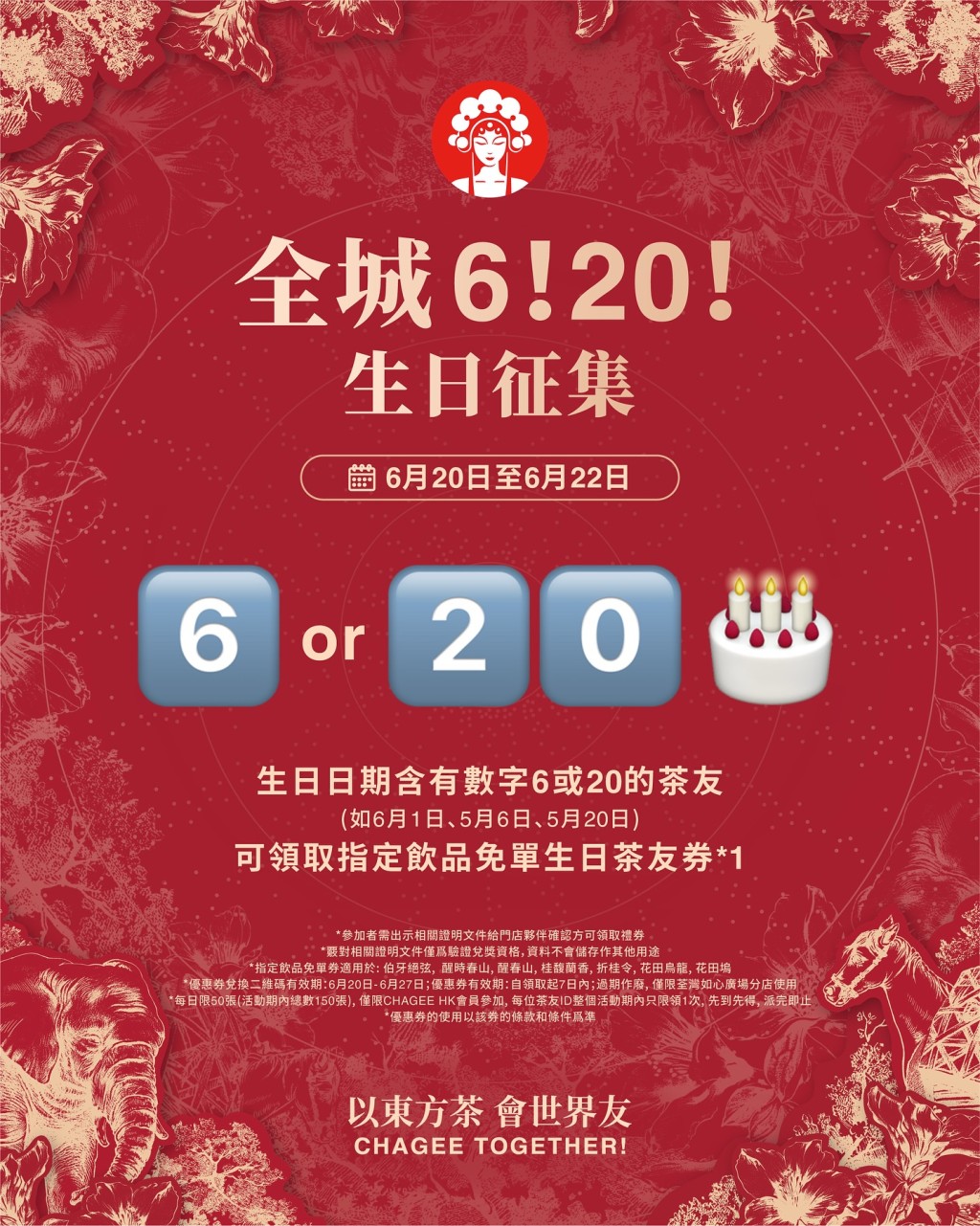 若你的生日日期或月份中,包含数字“6”或“20”,如6月1日、5月6日或5月20日,即可在6月20日至22日期间,到荃湾如心广场新开门店,扫码领取一张“指定饮品免单生日茶友券”的优惠券,并于6月20日至27日内,免费兑换伯牙绝弦、醒时春山、醒春山、桂馥兰香、折桂令、花田乌龙等,轻松享受高质量茶饮的愉悦。