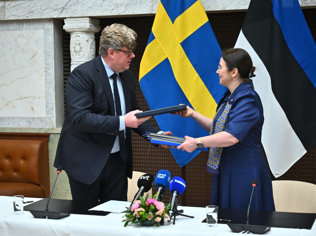 ▲瑞典司法部长 Gunnar Strömmer(左)和爱沙尼亚司法和数字事务部长 Liisa-Ly Pakosta 签署在爱沙尼亚租赁监狱的协议。法新社