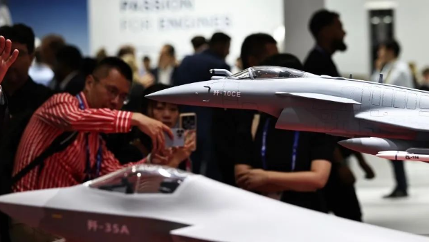 ▲6月17日,在法国巴黎近郊布尔歇机场举行的第55届巴黎航展上,人们在中国航空工业集团展台参观歼-35A、歼-10CE等模型。