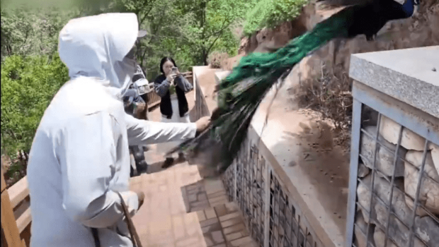 ▲男子抓孔雀尾羽,孔雀未能挣脱。