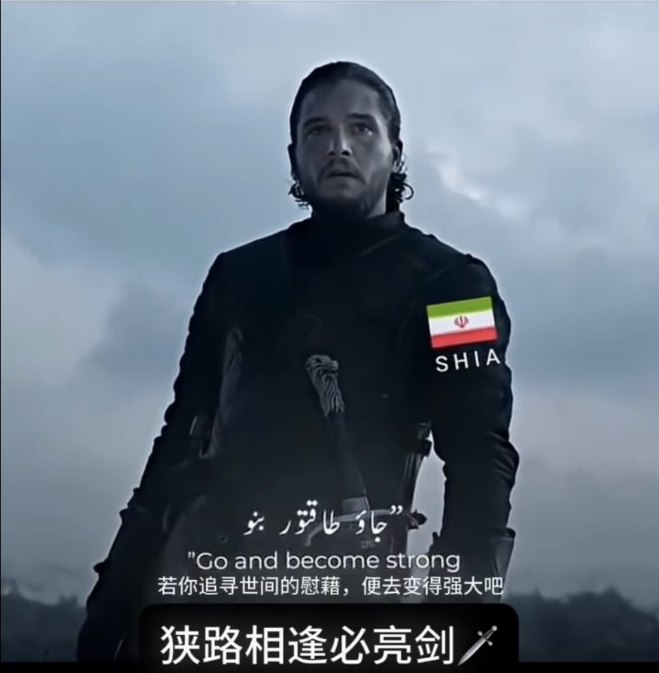 6月21日接近中午时分,伊朗驻华大使馆发在引用《权力游戏》的影片中,一名臂上有伊朗国旗、写着“SHIA”(什叶派)的战士,独自迎战冲着他而来的“千军万马”包括以列、加拿大、美国、澳洲、英国、法国、德国等国家,配文是“狭路相逢必亮剑”和剑的表情图案。