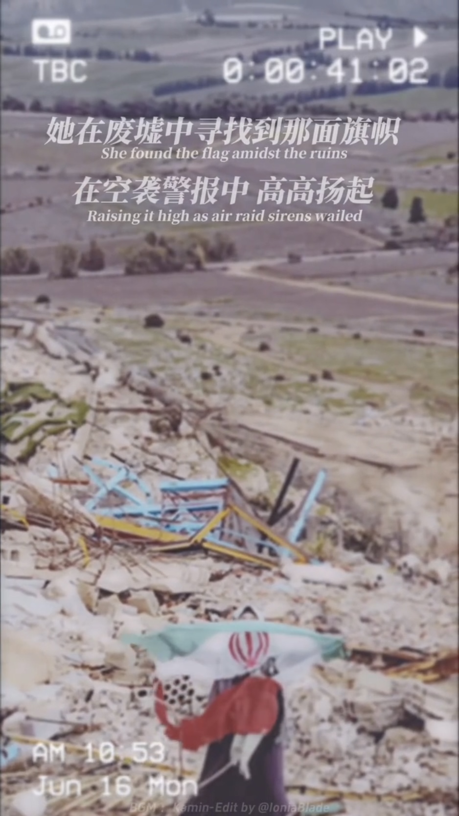 22日深夜,大使馆又发了另一段影片,显示一名女子发现伊朗国旗卡在一处废墟中。她小心翼翼取下国旗,随即在空袭警报声中高举国旗。画面最后出现“我们永不低头”的大字。微博发文则写““我们伊朗永不屈服”。