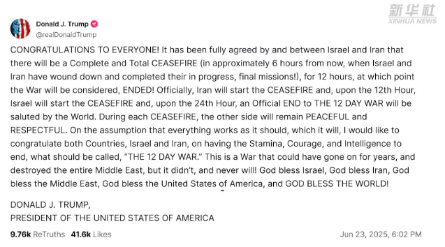 特朗普在美国东部时间当天18时02分(北京时间24日6时02分)发表的帖文中说,停火将在大约6小时后正式生效,届时以伊双方将完成各自正在进行的“最后任务”。