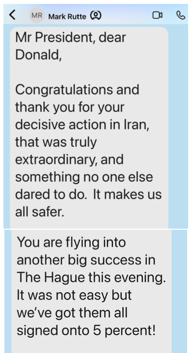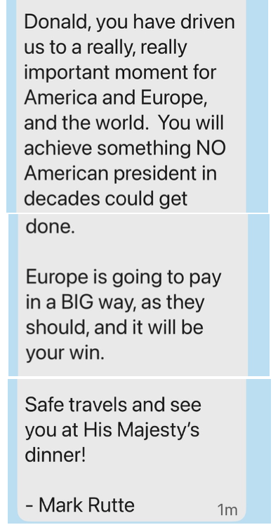 由特朗普上载的短讯截图中可见,吕特表示 :“总统先生,亲爱的唐纳德,恭喜并感谢您在伊朗问题上的果断行动,这真是非凡之举,是无人敢做之事。这让我们所有人都更加安全了。”吕特续称:“今晚您将在海牙再次迎来巨大成功。尽管过程并不容易,但我们已经让所有人同意那项5%的计划了!”