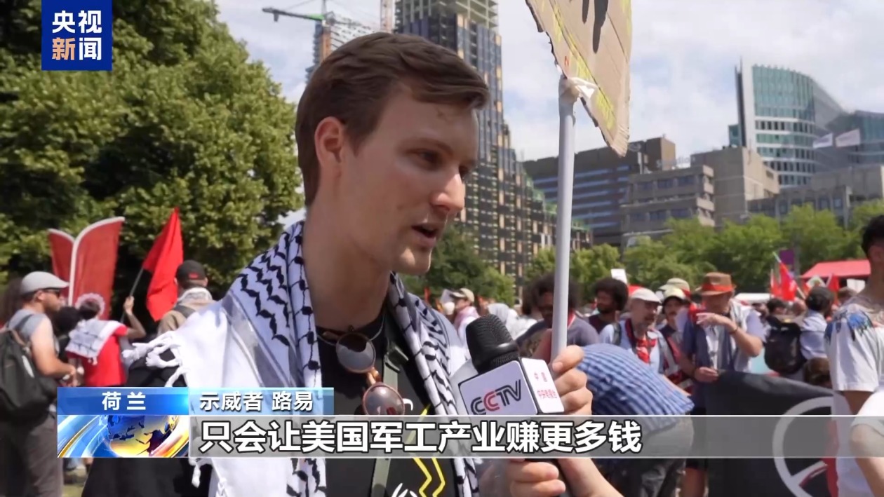 总台记者 顾鑫:在北约领导人讨论如何强化武装的时候,街头响起了不同的声音。在海牙,我们看到来自荷兰、法国、比利时、卢森堡等欧洲各国的不同人群走上街头,反对以和平之名推动军费激增。