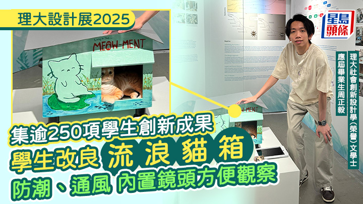 由香港理工大学设计学院举办的“理大设计展2025”由即日起至8月8日举行,今次展览集逾250项来自设计学士及硕士课程学生的创新成果,昨日举行作品导赏。 作品包括为流浪猫提供安全庇护的“宠浪”、旨在减少食物浪费的天然健康饼干“VEGO”、以及帮助长者进行手部复康的游戏化系统“MotoRehab”,展示学生如何通过设计创新解决生活中的实际问题。