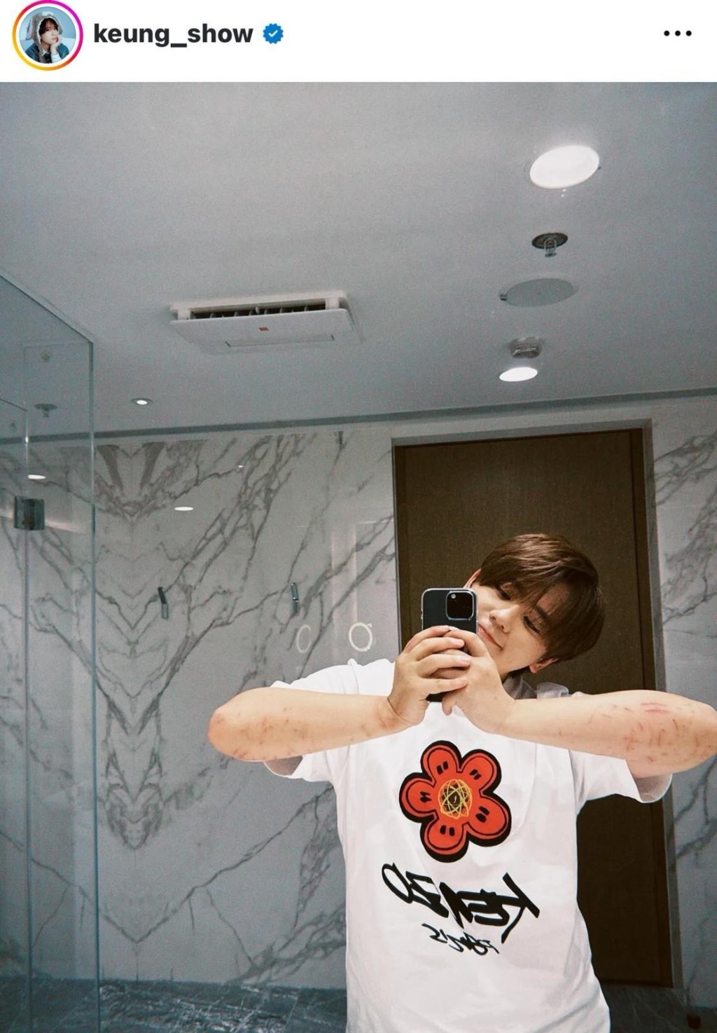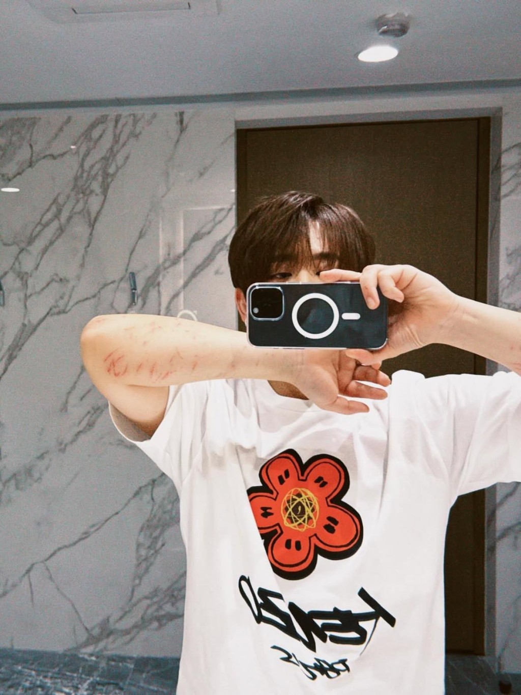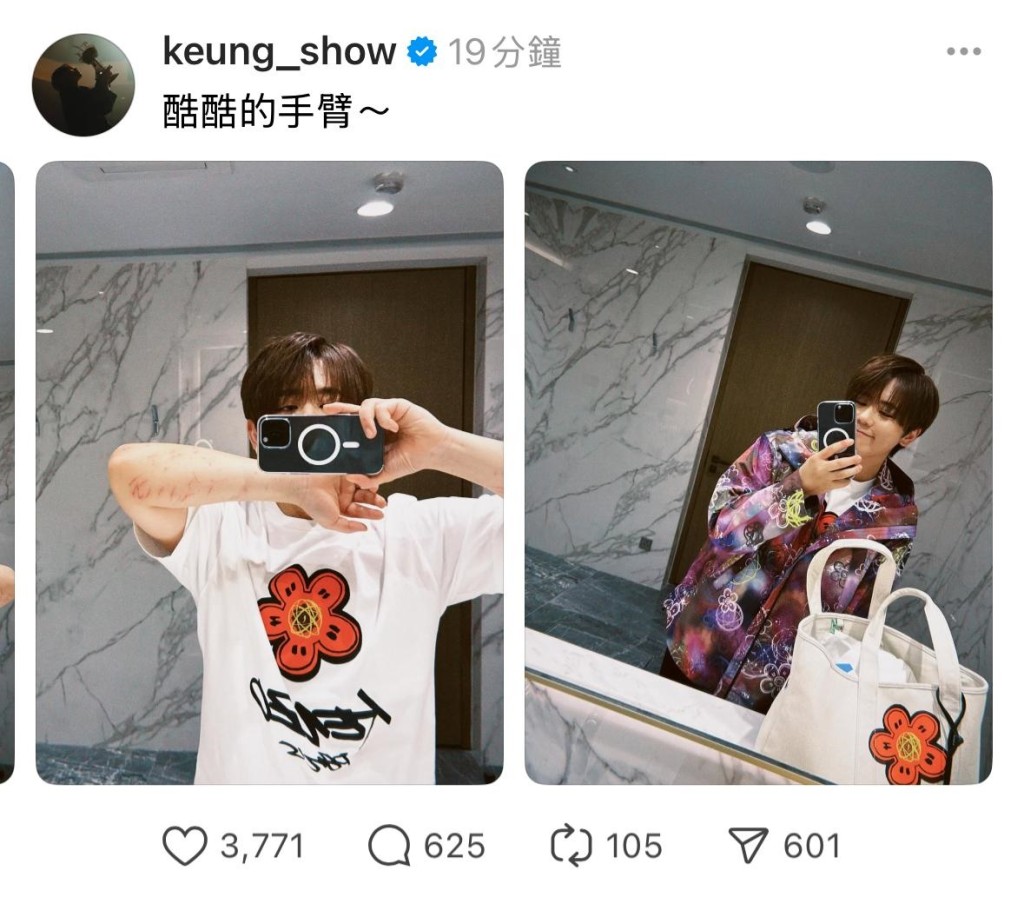 之后他更于社交网展现自己手臂的伤势,他酷酷的手臂来形容自己两只手臂,就照片所见,姜涛两只前臂都有极多细长的伤痕,加起来超过20个伤疤,部份已经结焦,属皮外伤居多。 而姜涛自拍时,同样面带笑容。
