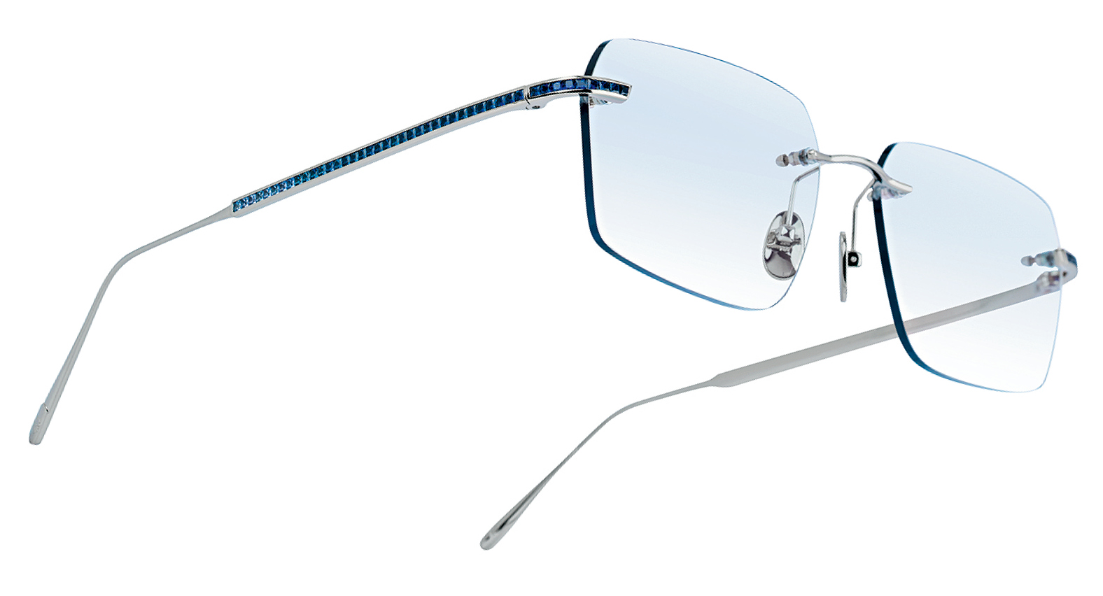 ▲LOTOS Eternity 18K白金蓝宝石款式,镜臂镶嵌88颗共重4.34卡公主方形切割蓝宝石,呈自然渐变效果。(售价待定)