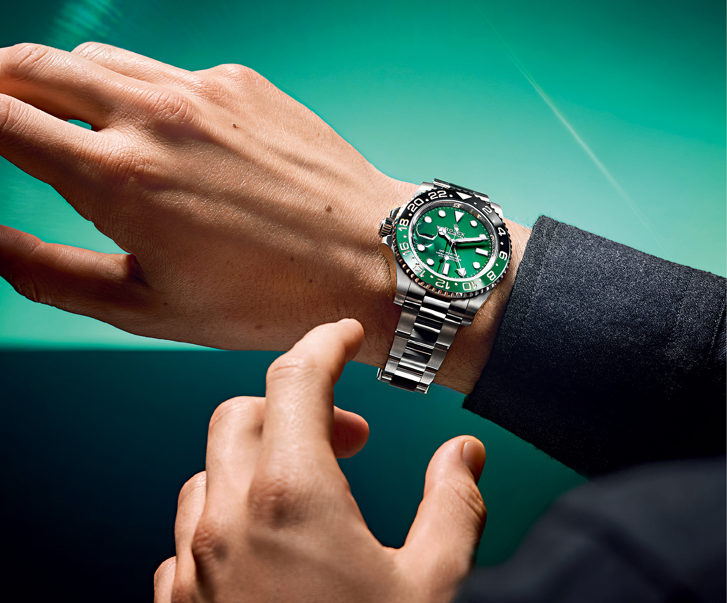虽然品牌向来不会高调推出周年庆生版,但今年是GMT-Master面世70周年,正有意想不到的新搞作。新推出的左手白金版,除了表圈以绿黑双色陶瓷制,还首次以绿色陶瓷制作表盘,很有绿玉的贵气感觉。($388,700)