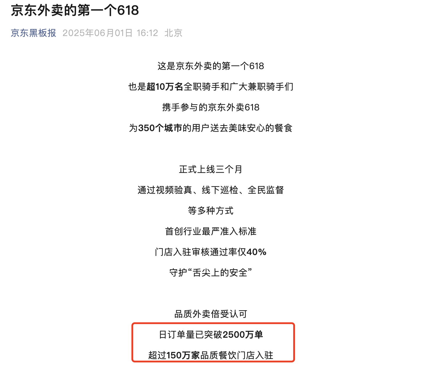 据京东黑板报披露,截至6月1日,京东外卖日订单量已突破2500万单,超过150万家餐厅入驻。
