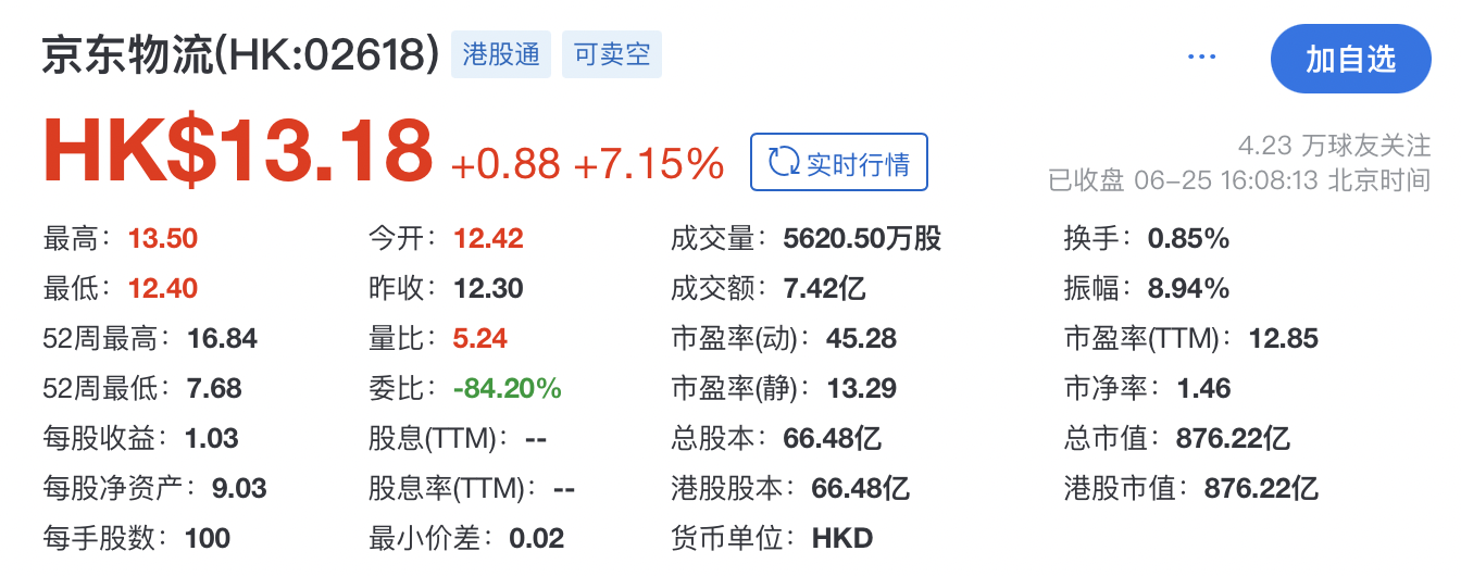 受益于此消息,6月25日,京东物流股价大涨。截至收盘时,其报13.18港元,涨7.15%,总市值约876.22亿港元。