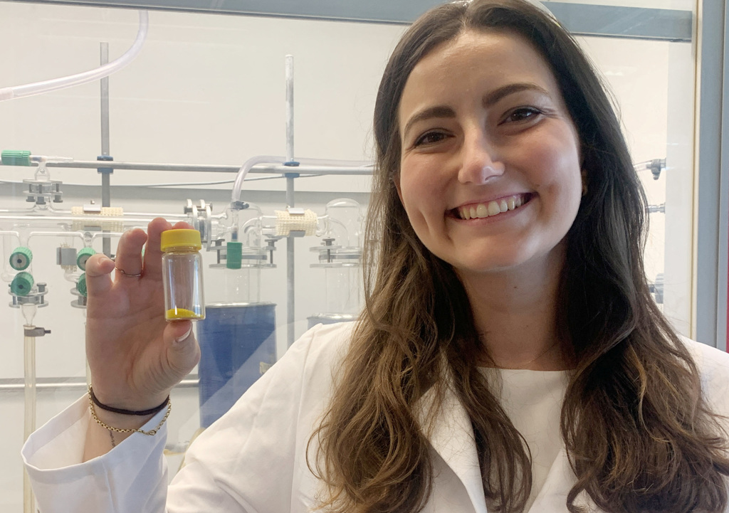 ▲苏黎世联邦理工学院研究员佩兰,发明新技术大幅提高从电子垃圾回收稀土元素的效能。她24日受访时出示实验室新开发的特殊萃取剂。(路透)