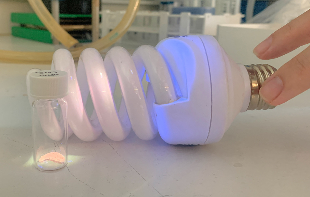 ▲佩兰24日展示从废弃灯泡回收的稀土元素铕,纯度近乎100%。(路透)