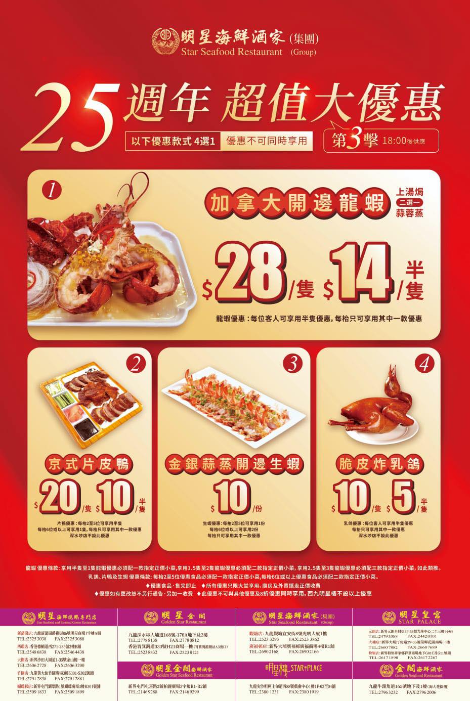 即日起,明星海鲜酒家推出周年晚市优惠(西九明星楼除外),每晚6时后入座可享超值菜式。首推加拿大龙虾($24/只),肉质饱满鲜甜;脆皮炸乳鸽($5/半只)外皮金黄酥脆,肉嫩多汁;金银蒜银丝蒸开边生虾($10/份)则以蒜香粉丝衬托虾鲜,风味独特。此外,京式片皮鸭分两种优惠:2-5位可享半只($10),5位以上则享全只,薄脆鸭皮搭配酱料饼皮,口感丰富。需注意每枱仅能四选一,且不与其他优惠迭加,适合小家庭或朋友聚餐。