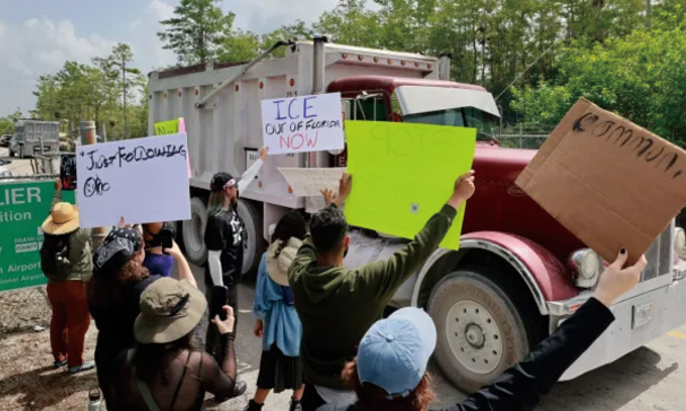 美国佛州州长动用紧急权力收地兴建非法移民拘留中心,引发当地人及原住民不满。数百名抗议者27日聚集高速公路两旁抗议,反对建造这栋“鳄鱼恶魔岛”(Alligator Alcatraz)。