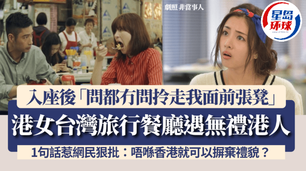 近日,有网民在Threads上以“麻烦香港人去旅行俾返少少礼貌”为题发文,分享自己在台湾旅行时遇到无礼香港人的经历。事主表示,当时自己独自一人在台北的京站时尚广场美食广场食饭,突然有4个香港人走过来在事主旁边桌入座,其中一名男子“见唔够凳,就问都冇问一嘢拎走咗我面前张凳。”